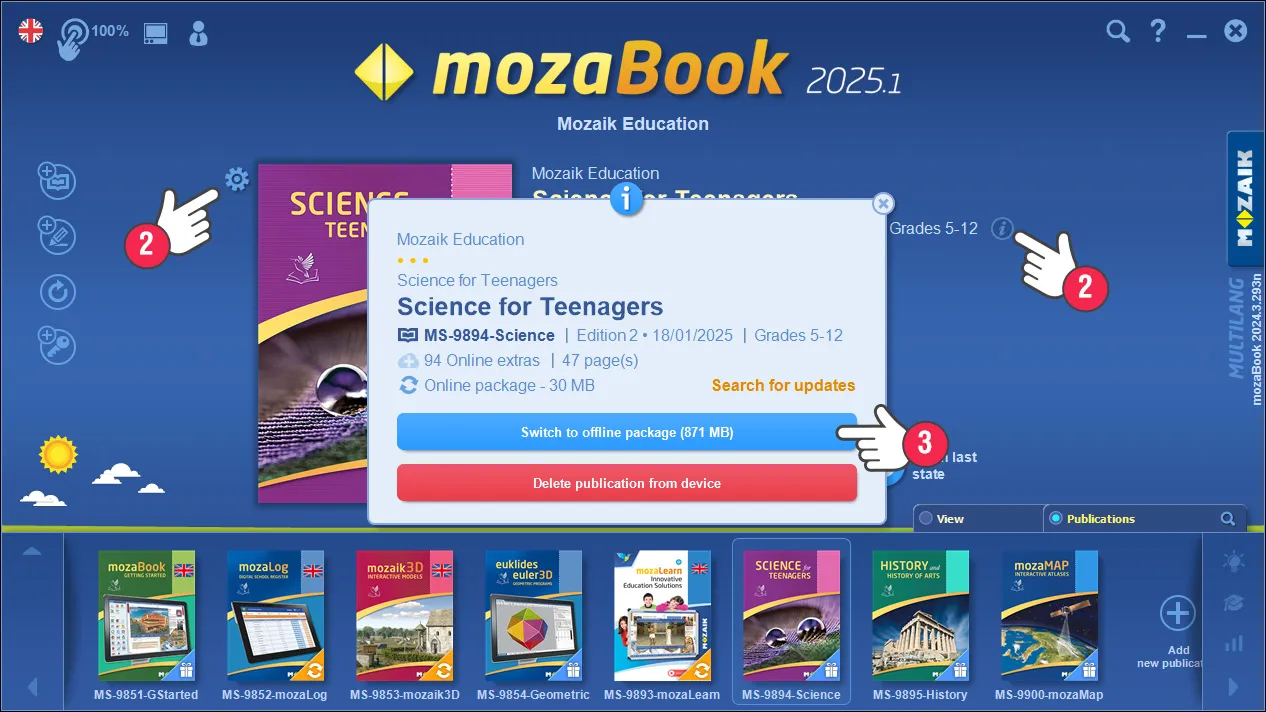 Im mozaBook kann man Publikationen sowohl als Online- als auch Offline-Version herunterladen (1). Offline-Pakete benötigen mehr Speicherplatz auf der Festplatte, aber nach dem Herunterladen können die Bücher und ihre interaktiven Inhalte (3D-Modelle, Videos, Aufgaben) ohne aktive Internetverbindung geöffnet und verwendet werden.