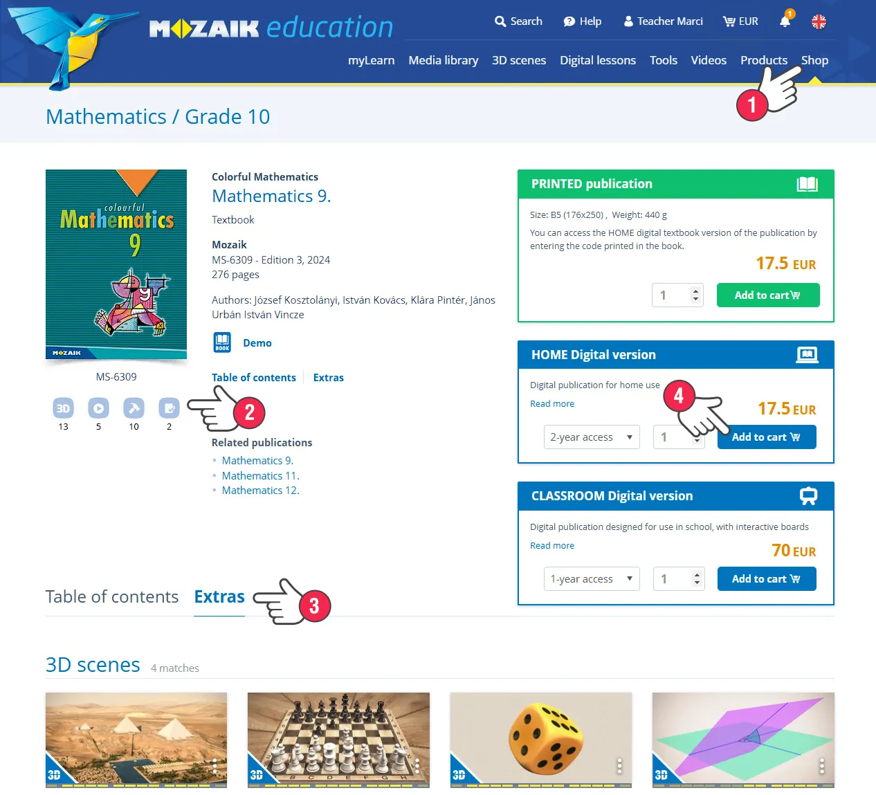 To buy the book, first choose whether you want the printed, HOME digital or CLASSROOM digital version. In the boxes of the different types, you can read their descriptions. Once you have decided which version suits your needs best, set the validity of the licence and add it to your cart (4). Read more on making a purchase here.