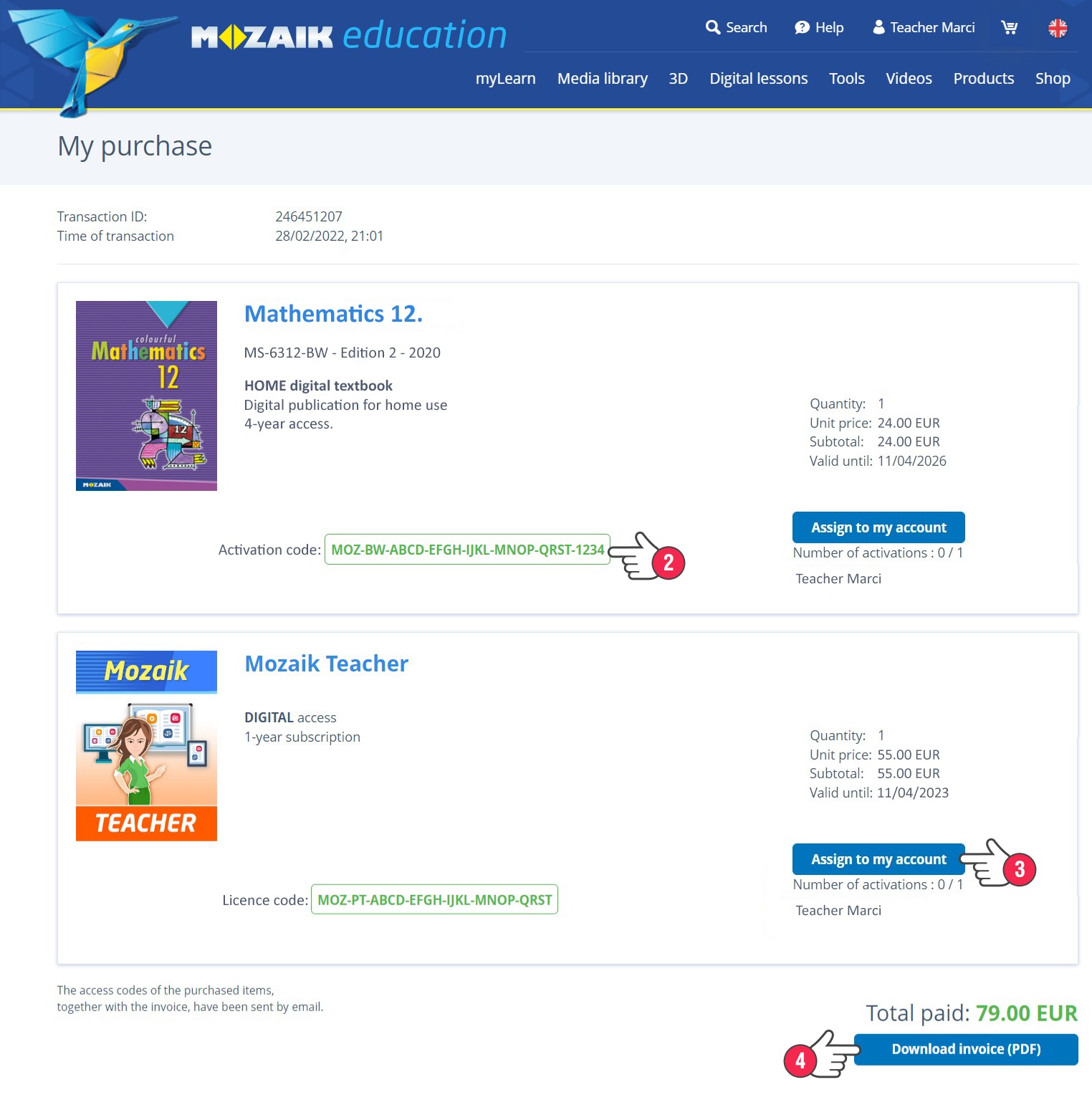 Auf dieser Seite finden Sie den Aktivierungs- bzw. Lizenzcode der von Ihnen gekauften Produkte (2). Digitale Bücher und Mozaik-STUDENT-Abonnements / Mozaik-TEACHER-Abonnements können auf dieser Seite mit einem Klick sofort aktiviert, d. h. mit Ihrem Konto verknüpft werden (3). Sie können hier zudem die Rechnung für die von Ihnen gekauften Produkte herunterladen (4).