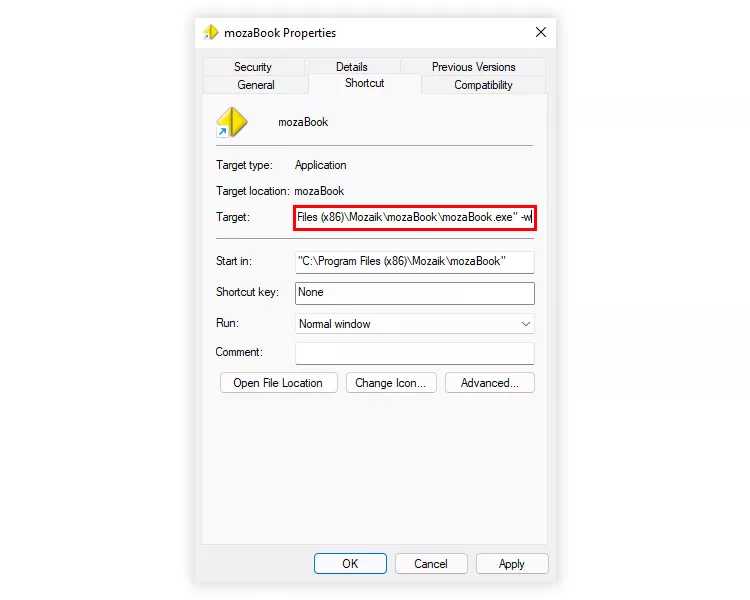 In the window that opens, find the Target field that usually contains "C:\Program Files (x86)\Mozaik\mozaBook\mozaBook.exe". Add a space to the end of this text, then add "-w".
