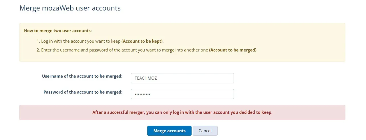 Er verschijnt een formulier. Vul daarin de gegevens in (gebruikersnaam of e-mailadres en wachtwoord) van het account dat je wilt samenvoegen (dus opheffen). Klik vervolgens op de knop Accounts samenvoegen. Is de informatie in de tabel juist, klik dan op de knop Accounts samenvoegen om het proces te starten.