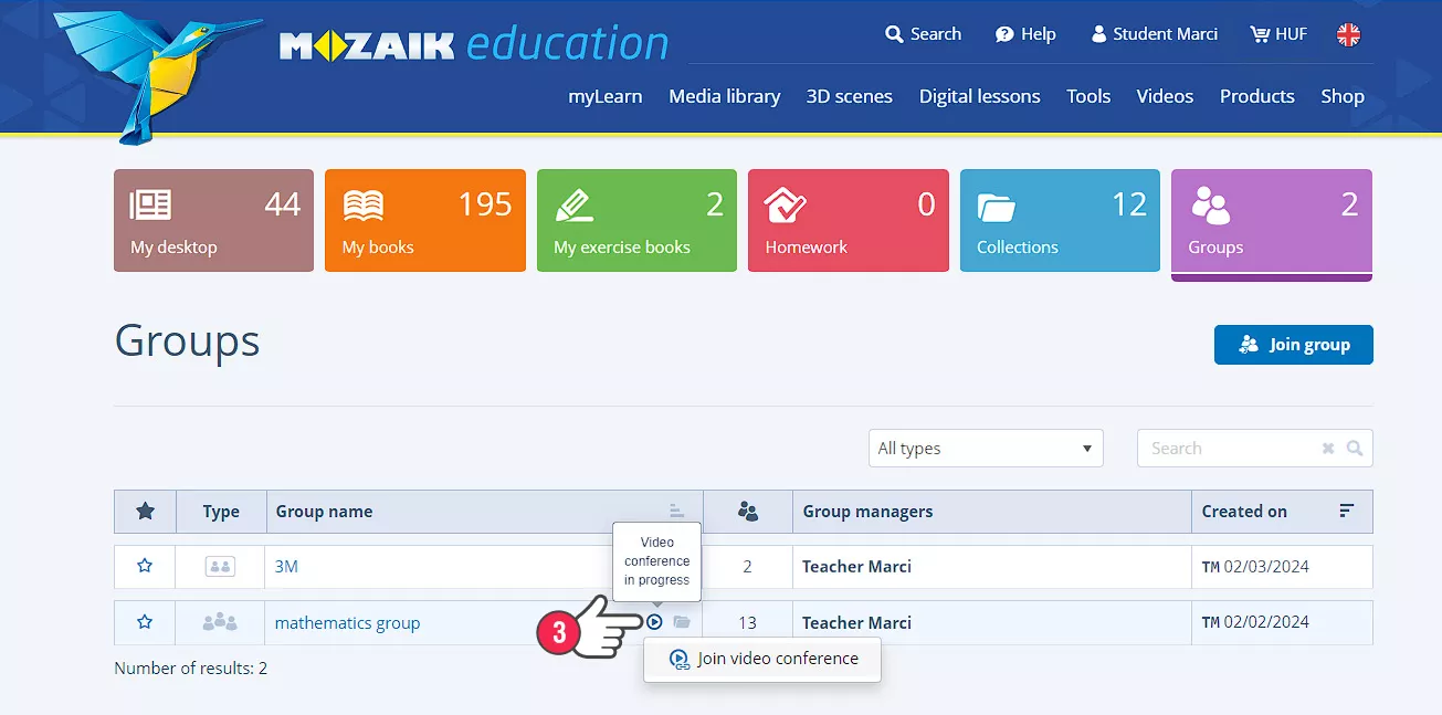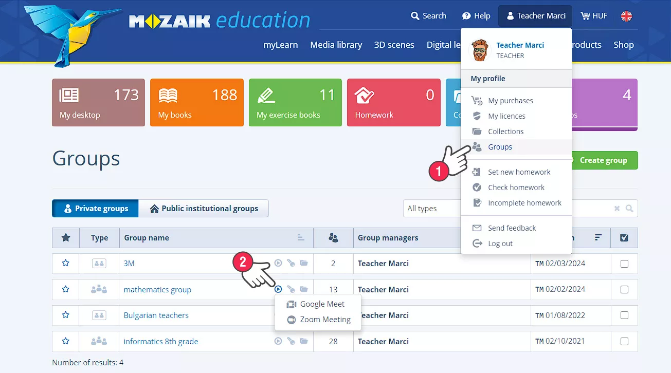 Pour lancer une visioconférence, sur la page Groupes (1), cliquez sur le bouton visioconférence (2) dans la ligne du groupe donné, puis sélectionnez la plateforme que vous souhaitez utiliser (Google Meet, Zoom).
