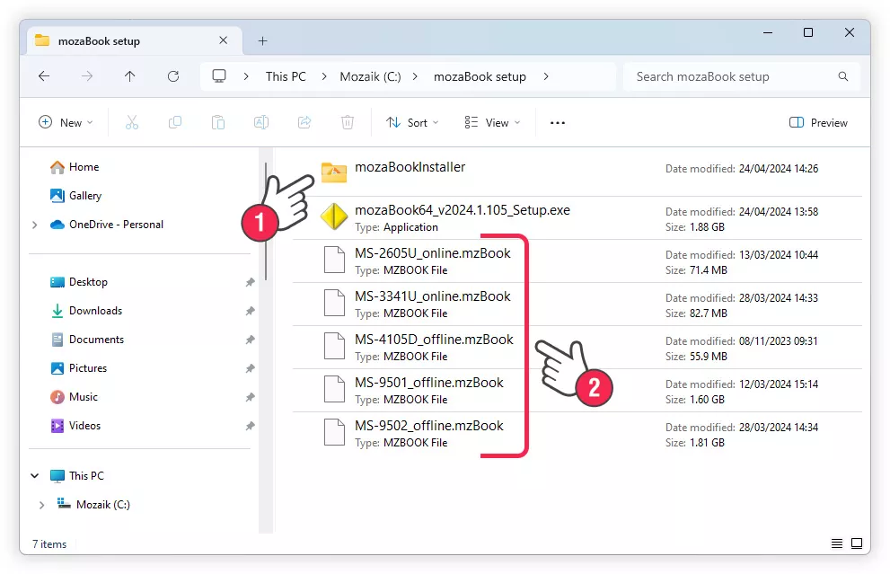 De gedownloade boeken met de extensie .mzBook worden in de map C:\Program Files (x86)\Mozaik\mozaBook\books\ gezet. Als je de .mzBook-bestanden naar het installatieprogramma kopieert (2), worden die ook geïnstalleerd.