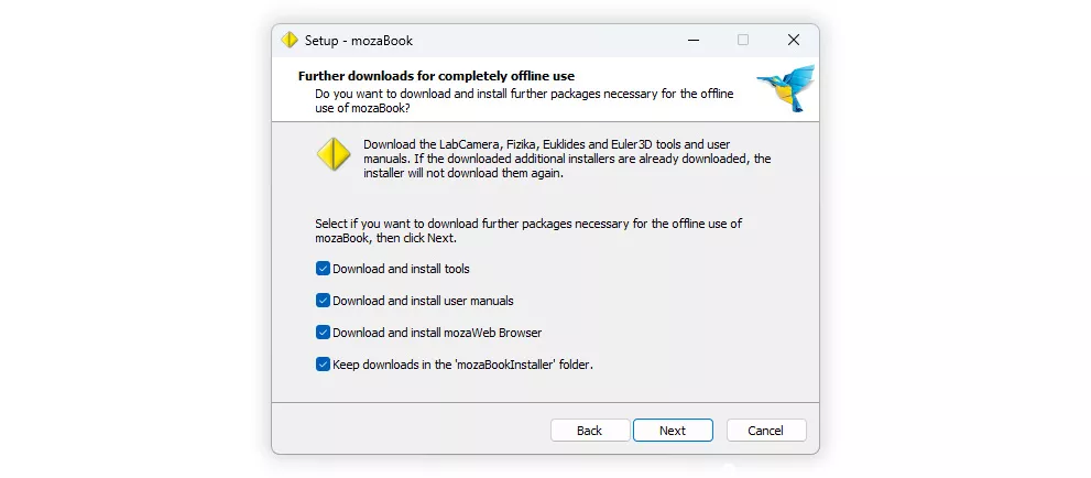 Als deze map al bestaat aan het begin van de installatie (1), worden ontbrekende onderdelen niet gedownload van internet, maar in plaats daarvan geïnstalleerd vanuit de map mozaBookInstaller.