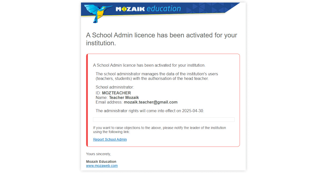 Pour des raisons de sécurité, pendant l'activation d'une licence School Admin, tous les utilisateurs de l'institution seront notifiés par courrier électronique du fait que la personne ayant activé la licence gèrera leurs données en tant qu'utilisateur disposant des droits School Admin. La notification par courrier électronique comporte le nom, le nom d'utilisateur mozaWeb et l'adresse électronique inscrite de la personne ayant activé la licence.