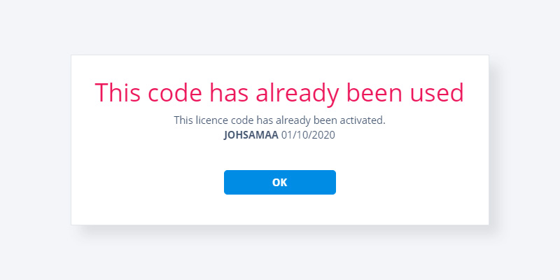 Es ist möglich, dass Sie versuchen, eine Lizenz zu aktivieren, die bereits von einem anderen Benutzer aktiviert wurde. In diesem Fall erhalten Sie die folgende Meldung: