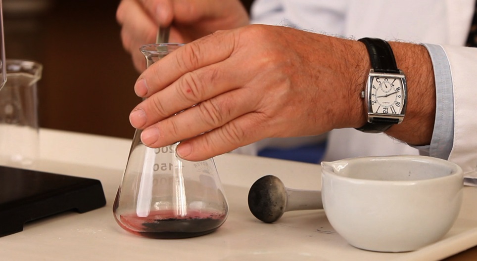 Reinigen einer mit Fuchsin gefärbten Lösung mit fein gemahlenem Aktivkohlegranulat und einem Filter.