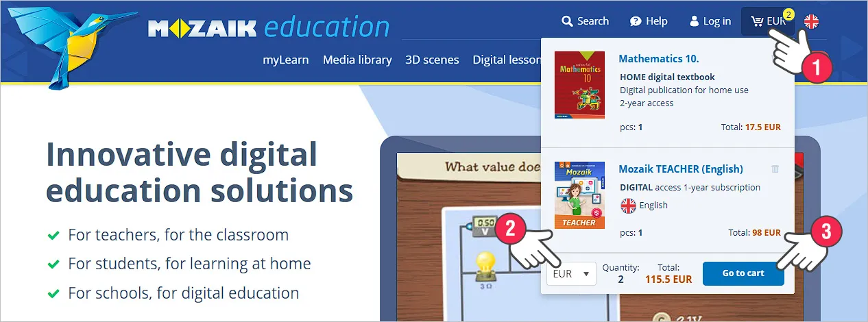 Als alle producten die je wilt kopen in je winkelwagentje staan, klik je bovenaan de pagina op het winkelwagentje (1). Kies de valuta (2) in het uitklapmenu waarin de factuur moet worden opgesteld (dit hoeft alleen als je dat nog niet eerder hebt gedaan) en klik vervolgens op de knop Mijn winkelwagentje (3).